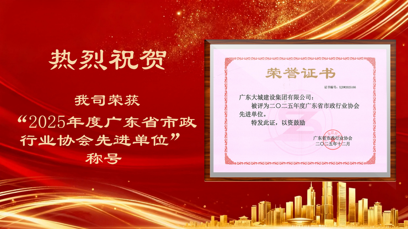 時間記錄著奮斗的足跡。2025年12月29日,廣東省市政行業協會公布2025年度先進單位評選結果,我司憑借在市政工程領域的綜合實力、創新貢獻及社會責任擔當,榮獲“2025年度廣東省市政行業協會先進單位”稱號。